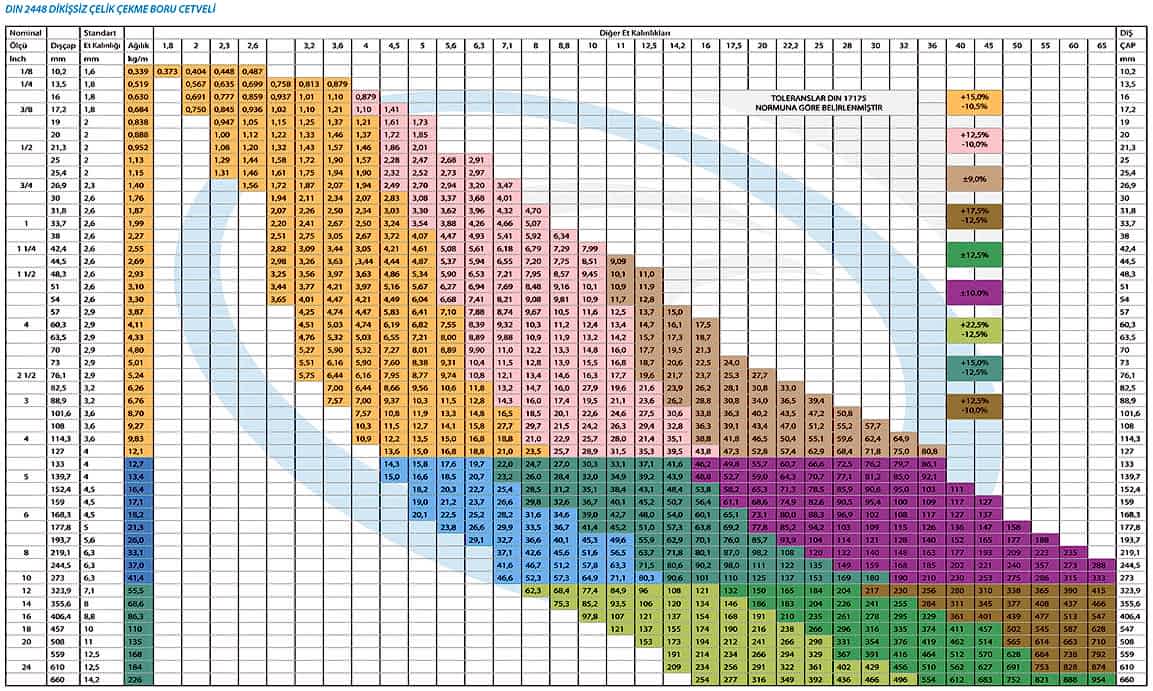 304-304L-316-316L -316Ti – 317L– 321 – 310 / 310S –314 – 1.4462 Duplex – 904L Super Duplex kalitelerinde Avrupa, Güney Kore ve Çin menşeili olmak üzere çok geniş bir yelpazede, her türlü çap ve kalınlıkta stoklarımızda mevcut olup, farklı kalite ve ebat istekleriniz en kısa sürede yurtdışından ithal edilmektedir.